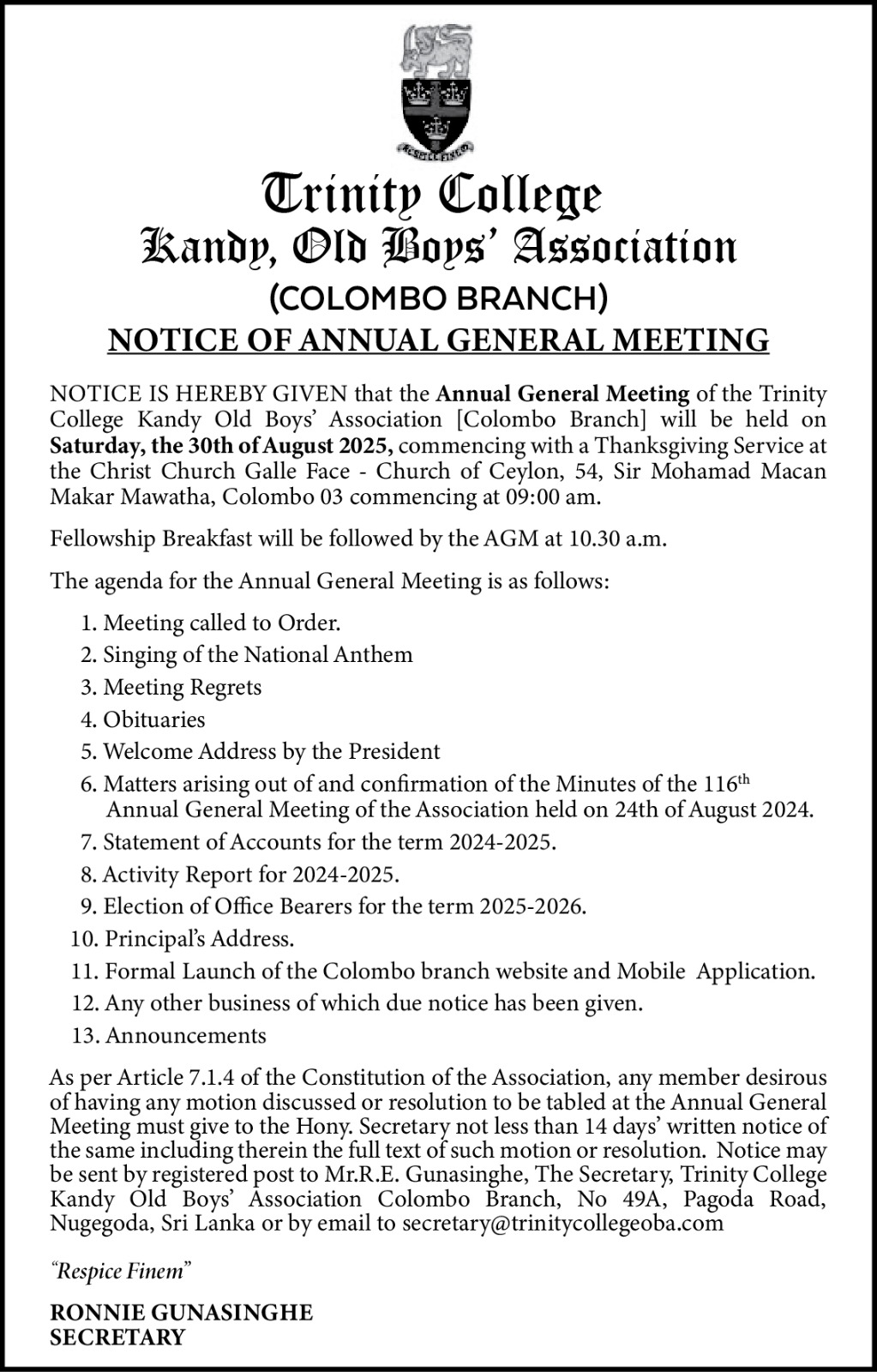 As per Article 7.1.4 of the Constitution of the Association, any member desirous of having any motion discussed or resolution to be tabled at the Annual General Meeting must give to the Hony. Secretary not less than 14 days written notice of the same including therein the full text of such motion or resolution. Notice may be sent by registered post to Mr.R.E. Gunasinghe, The Secretary, Trinity College Kandy Old Boys'